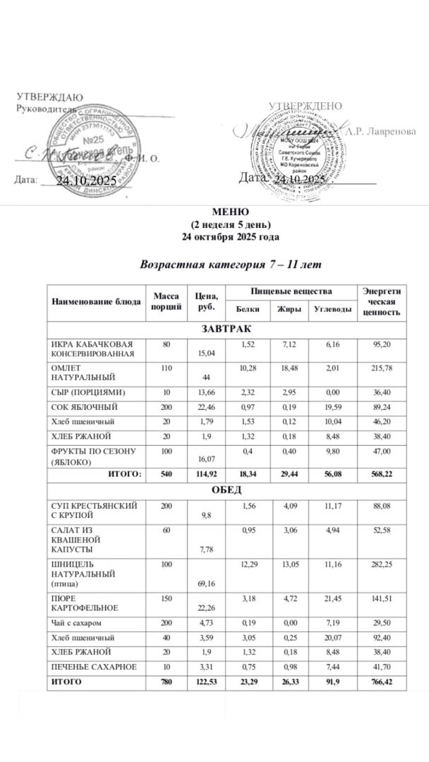 Примерное 10-дневное меню 7-11 лет