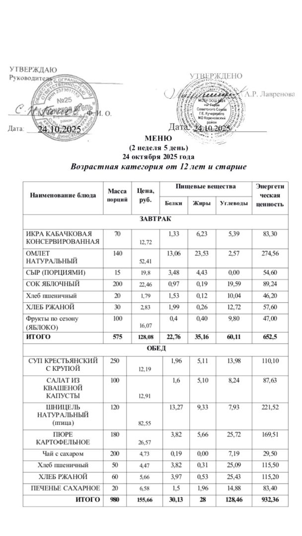 Примерное 10-дневное меню 12 лет и старше